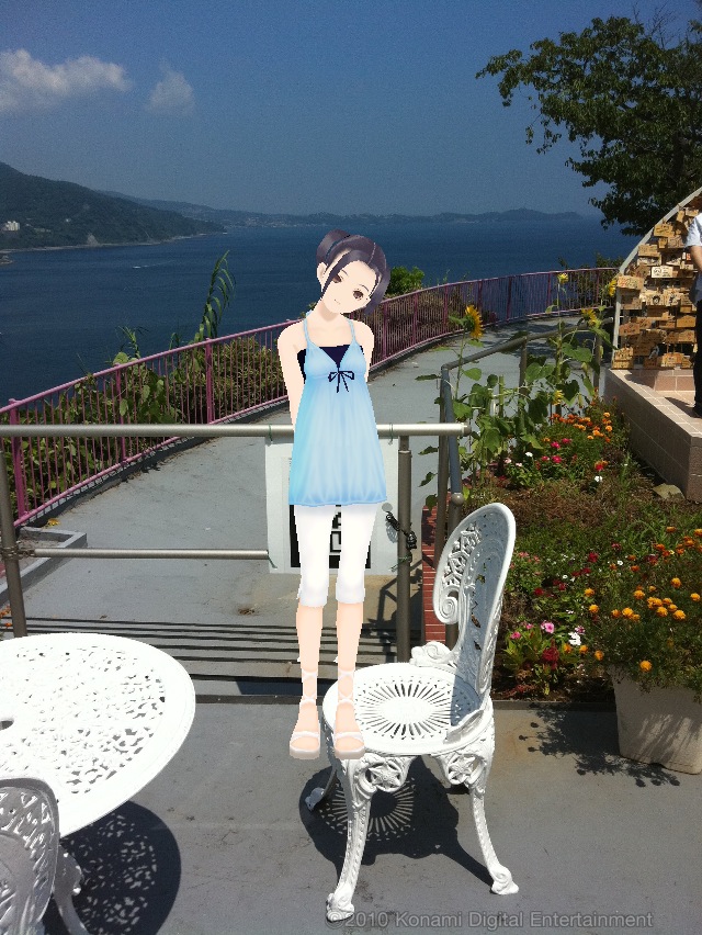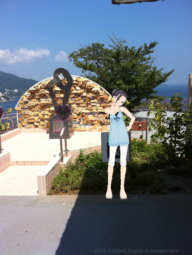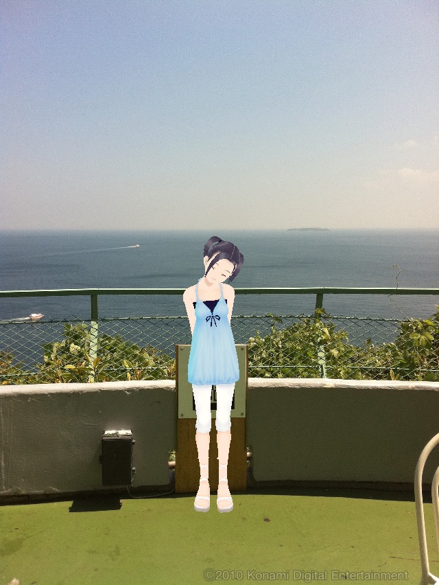 かわりに、ロープウェイ降りる前に写した 凛子しゃんと初島ののAR写真で我慢・・・。 |